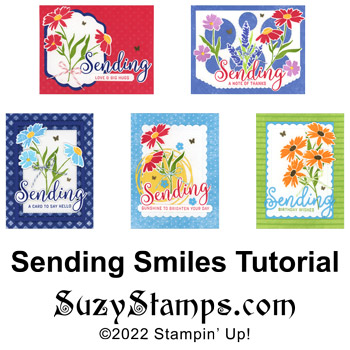 The Sending Smiles Tutorial is a pdf with instructions to make 5 greeting cards featuring the Stampin' Up!© Sending Smiles Stamp Set, Sending Dies and Tea Boutique Cards & Envelopes.